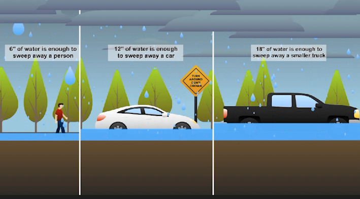 Emergency officials urge drivers to follow the phrase “Turn Around, Don’t Drown” and never attempt to cross flooded roadways.