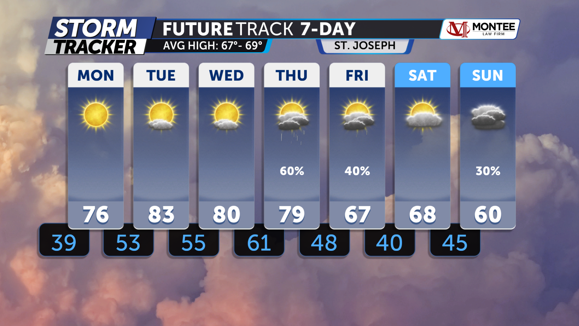Mostly sunny, mild, and breezy conditions have made for a fantastic Sunday across Northwest Missouri and Northeast Kansas. A clear and cool night is ahead with lows falling into the upper 30s to low 40s well after midnight. Despite a chilly start early Monday morning, afternoon highs will warm into the mid to upper 70s with lots of sunshine. Dry skies and a warming trend will continue Tuesday and Wednesday as highs climb into the 80s, before rain and thunderstorm chances return by Thursday.
