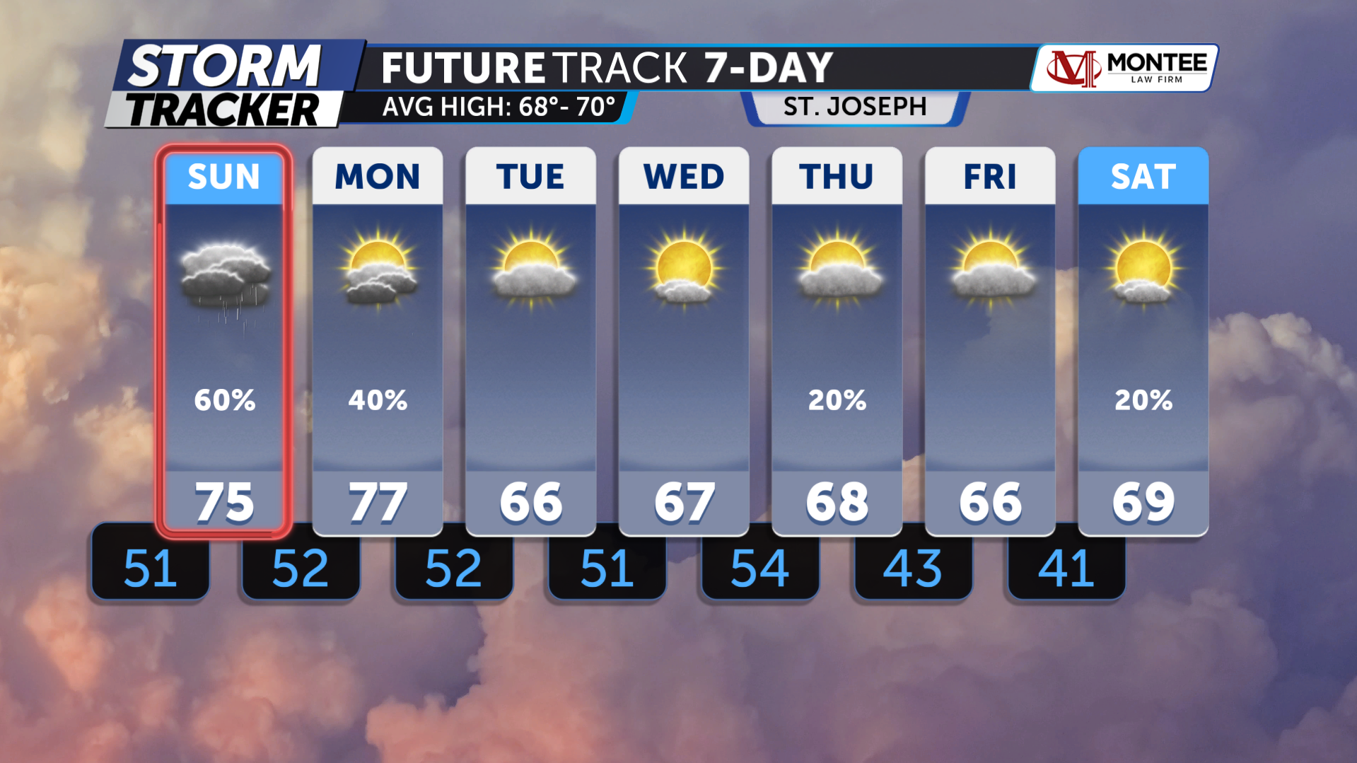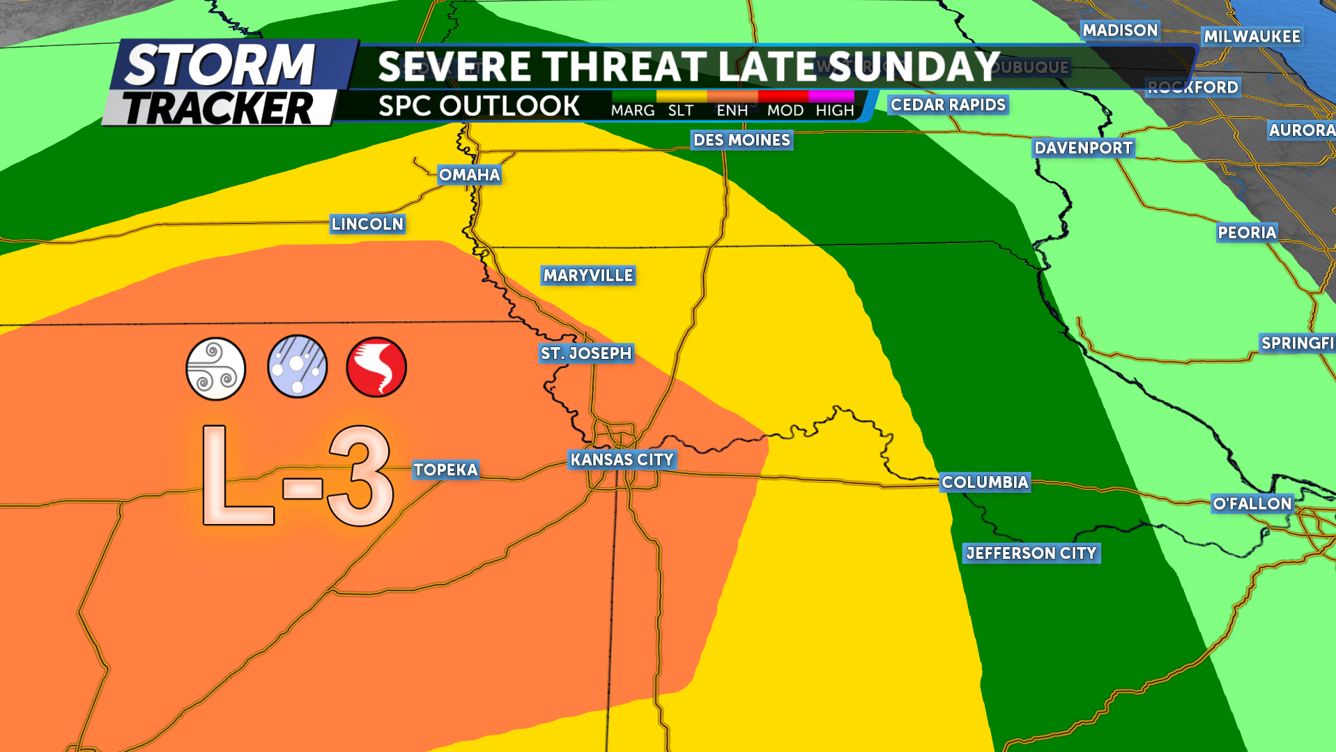 A warm and dry Saturday afternoon will give way to isolated t-storm chances across Northwest Missouri and Northeast Kansas Saturday evening and overnight, with lows falling into the mid to upper 50s after midnight and mostly cloudy skies. Skies remain unsettled Sunday with considerable cloud coverage, highs in the 70s, and a chance of scattered strong to severe thunderstorms for the evening and overnight hours. Damaging winds, sizable hail, and a tornado or two will be possible late Sunday, especially west of the Missouri River across Northeast and East Central Kansas.